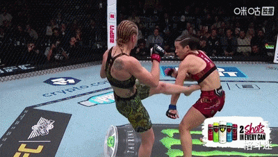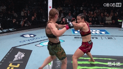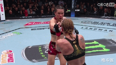 第四回合,子弹开始加强了进攻节奏,腿法频频命中,并试图以近身的膝击收割比赛。在面对张伟丽的扫踢时,她也以接腿成功摔倒,继续上位压制。